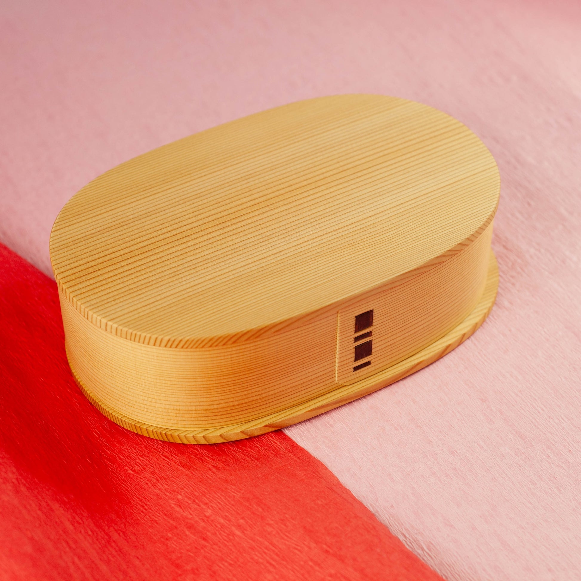 The Magewappa | Koban is a large, one-tier, oval shaped box with a lid that covers the sides of the box.