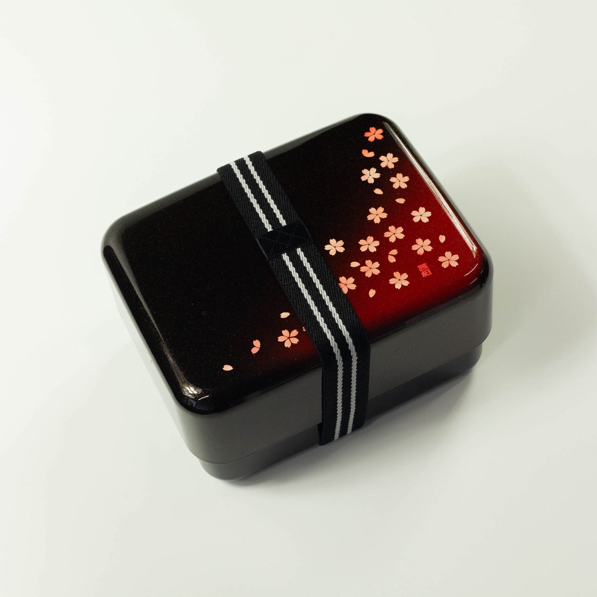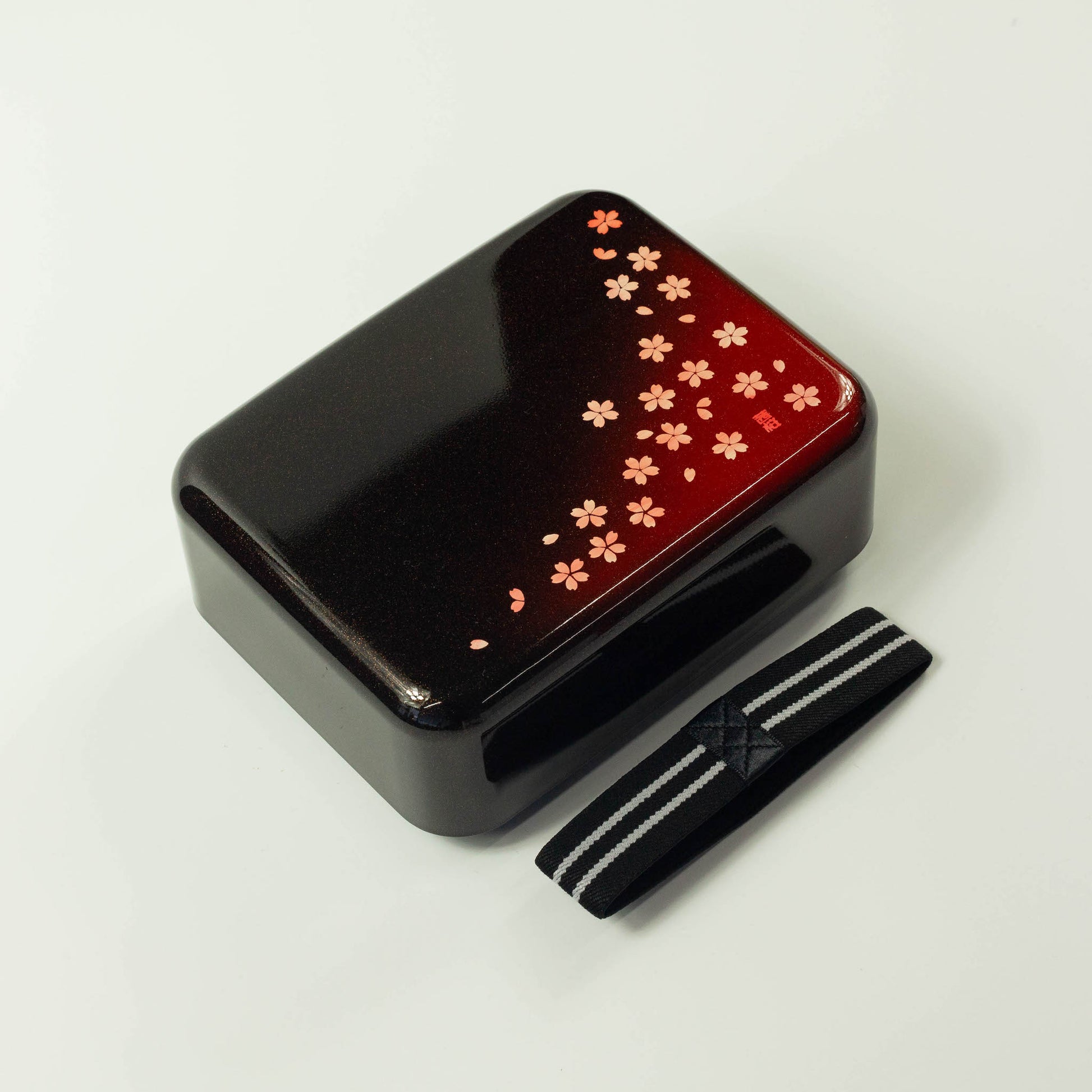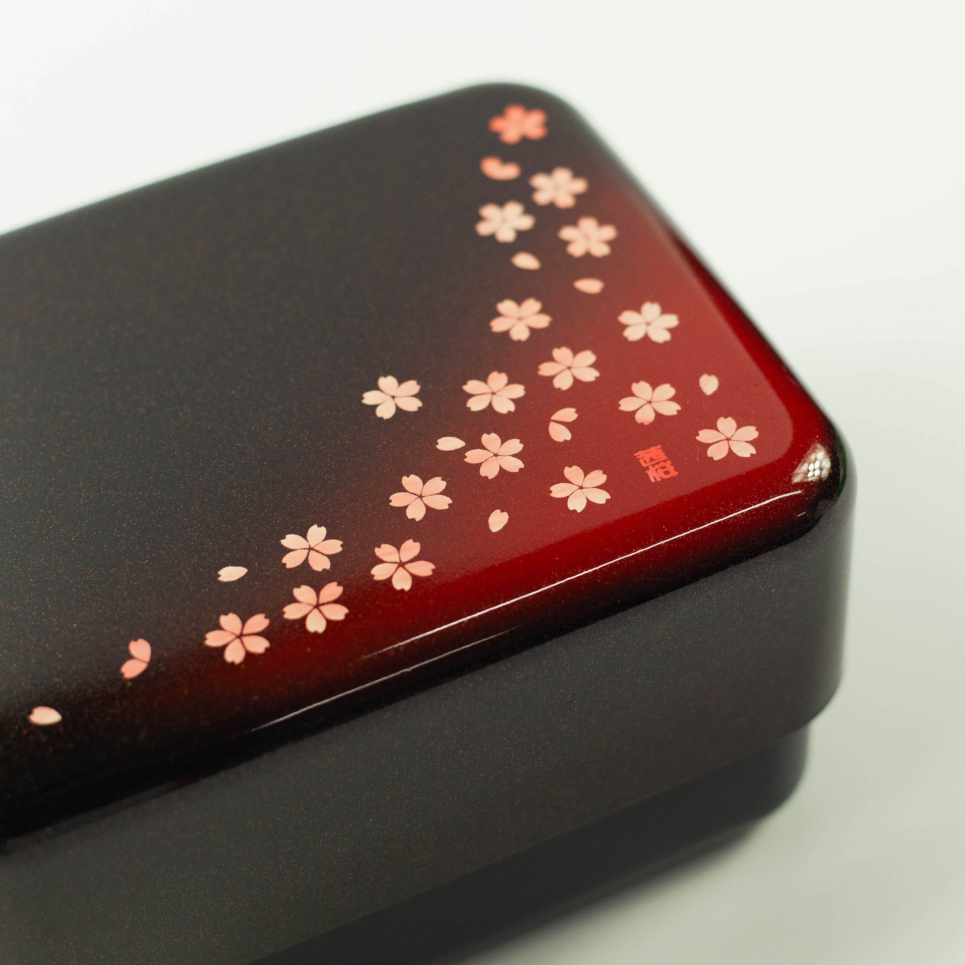 Eine großzügige Lunchbox, die Sakura Petals Big Bento Box 1300 ml ist eine zweistöckige Box mit einem wunderschönen Design aus fallenden Sakura-Blütenblättern vor einem glänzenden und schimmernden roten und schwarzen Hintergrund. Handbemalt von Kunsthandwerkern in Ishikawa, Japan.
