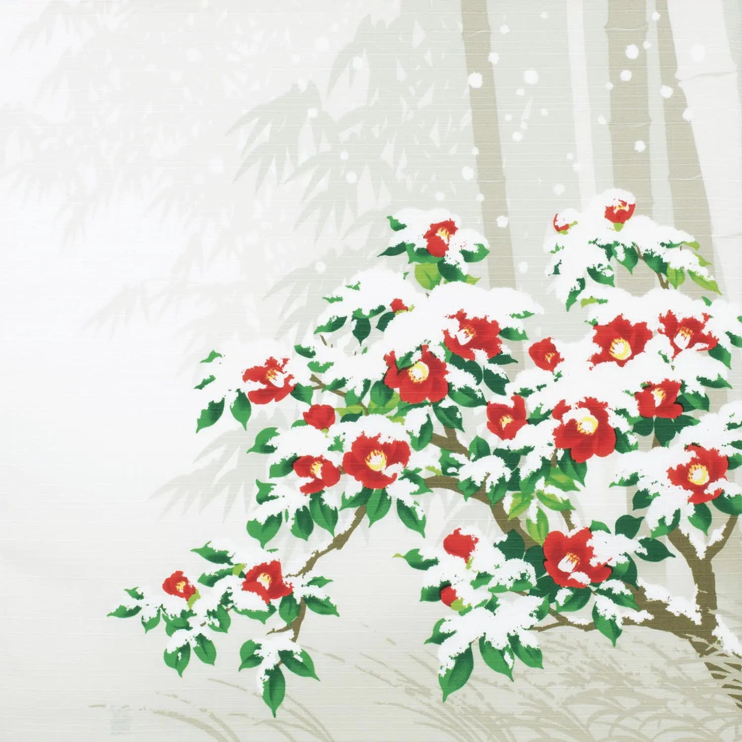 Made from 100% cotton, this elegant wrapping cloth depicts red camellia blossoms (tsubaki) blooming through soft layers of snow — a symbol of resilience and grace during the cold season. In the background, bamboo shadows fade into mist, evoking the peaceful atmosphere of a snowy garden.