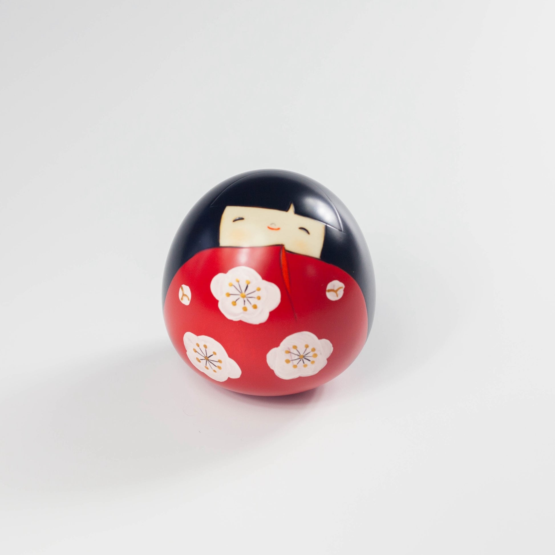 This elegant doll features a soft, rounded silhouette and a serene smile inspired by the Japanese proverb “Nana korobi, ya oki” (七転び八起き) — “Fall seven times, stand up eight.” It represents resilience and perseverance in the face of life’s challenges. The bright red kimono, adorned with white plum blossoms, adds a touch of springtime grace to this timeless figure.