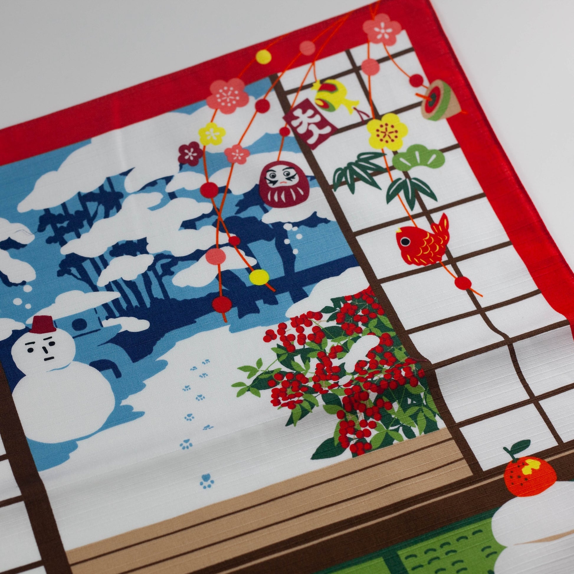 Decorated with seasonal motifs such as plum blossoms, bamboo, and kagami mochi, this furoshiki celebrates the spirit of Japanese New Year and the joy of home in winter. Perfect for wrapping a bento, a small gift, or displaying as festive wall art.