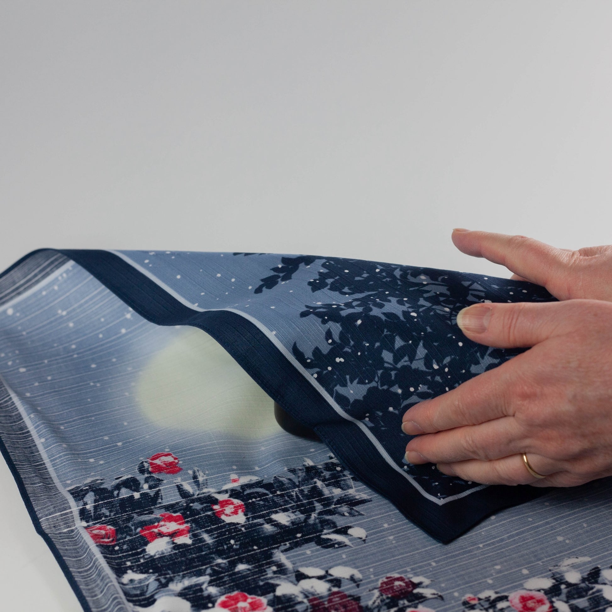 This exquisite 50cm wrapping cloth depicts red camellias (tsubaki) blooming under softly falling snow, illuminated by the glow of a full moon. The delicate balance of light and shadow evokes a sense of peace and quiet reflection — the calm stillness of a Japanese garden on a winter evening.