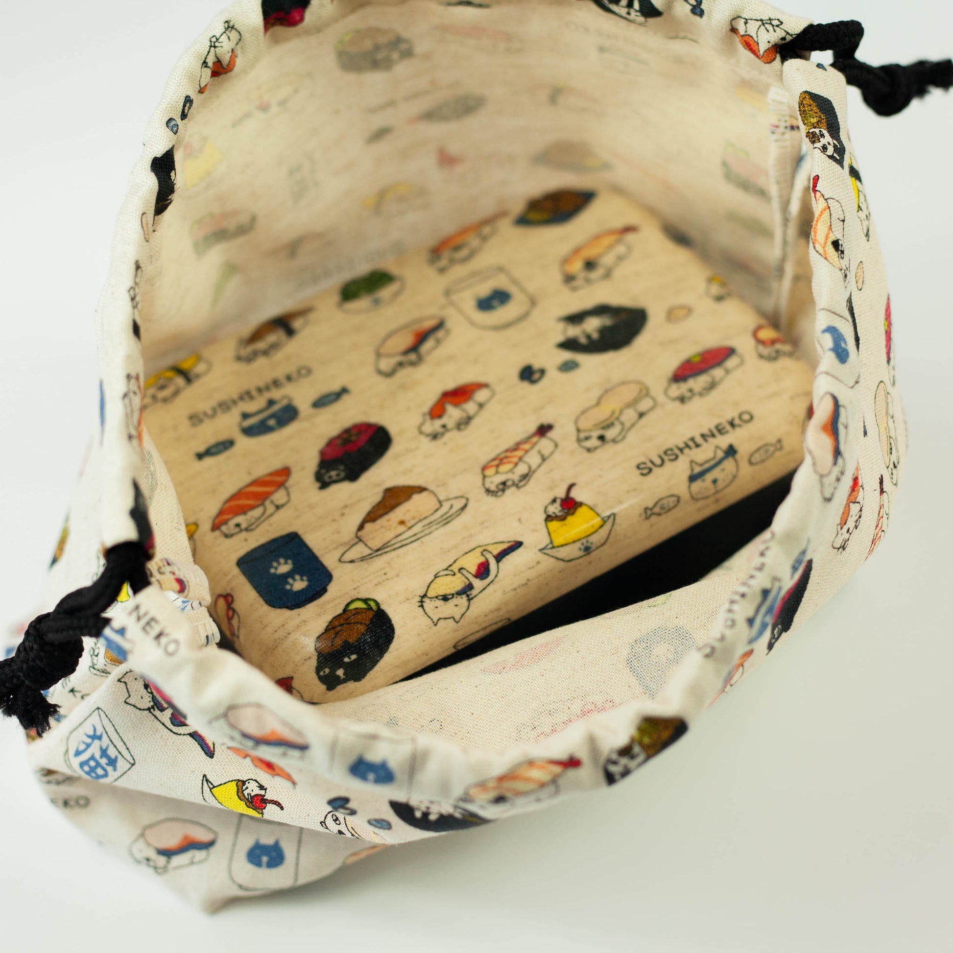 The story: Several years ago, our team found this amazing cat themed textile from a beloved, local fabric store here in Kyoto. We then asked our partner artisans in Ishikawa prefecture to use this fabric to create original bento boxes and bags, to great reception!  This time, we are excited to launch the bento with a fun new fabric design, Sushi Neko!